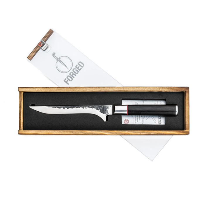De Sebra serie van Forged is een opvallende verschijning binnen het merk. Deze serie onderscheidt zich op een aangename manier door de donkere houtsoort die is gekozen voor het vervaardigen van het heft. Dit prachtige donkere hout dat afkomstig is uit Afrika luistert naar de naam Dalbergia melanoxylon. De Afrikaanse vertaling hiervan is Sebra en daarmee ook de naam van deze serie: Sebra Forged. Het donkerhouten heft straalt warmte uit, noem het chique. En het is juist deze uitstraling, die samen met het gehamerde lemmet en het subtiele rode detail bij de krop van deze serie echt iets bijzonders maakt. Kortom, met Sebra Forged haal je een stoere en uiterst stijlvolle messenserie in huis die gezien mag worden.